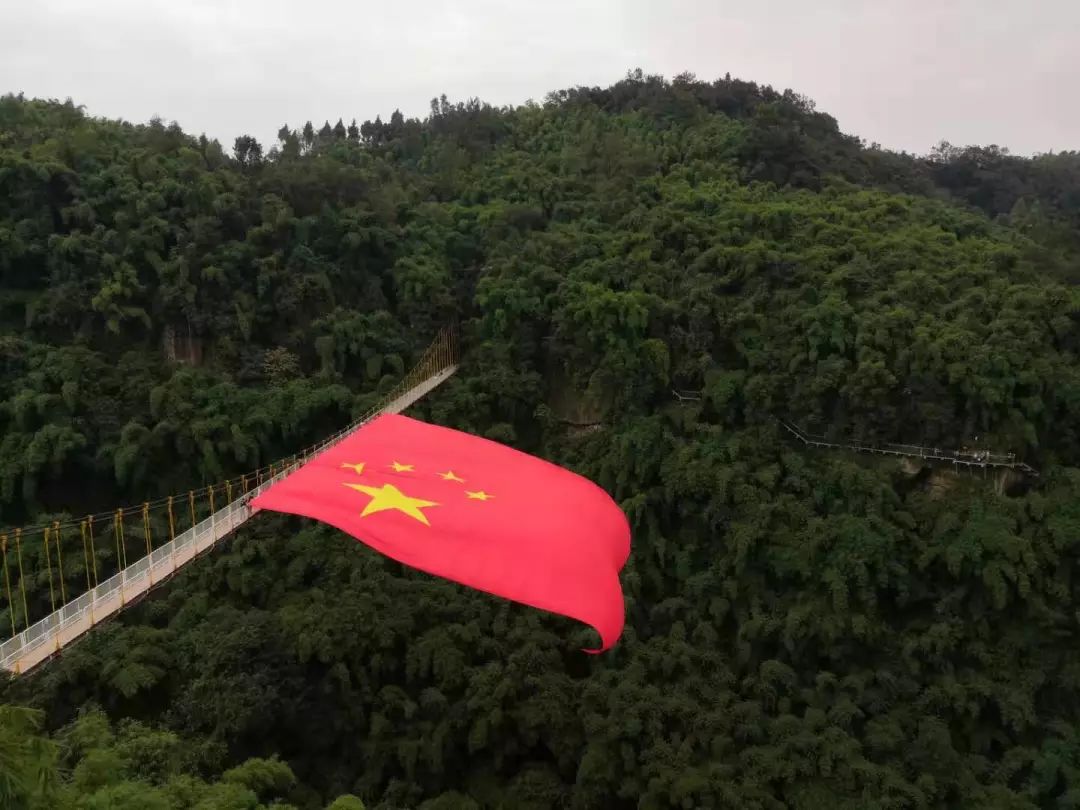 在即将到来的建国70周年这个特殊的时刻在川西竹海那被誉为全国第一高空窄底峡谷旅游索桥上70米巨幅国旗即将亮相!!!横贯两峰的索桥,据地百米,人行于桥上如云端漫步