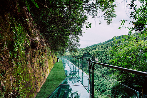 在半腰绝壁上打造的玻璃栈道,全长260米、宽1.5米、垂直地面高度近百米,是”水、林、光、石、声“的完美结合。这里难忘的景色,成为了婚礼摄影的绝佳背景,也成为每一对情侣所钟爱的爱情栈道。
